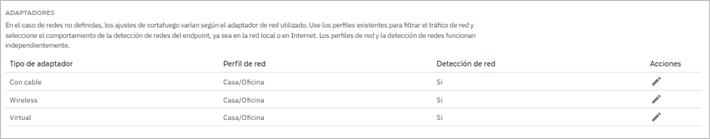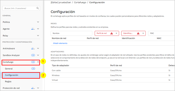 Describe el perfil de red asignado a un tipo de adaptador específico. Dejar que Windows decida: para cualquier nueva conexión de red detectada después de aplicar la política, el agente de seguridad de Bitdefender aplicará un perfil para el firewall basado en la clasificación de red en Windows De confianza: Desactiva el firewall de los adaptadores correspondientes. Todo el tráfico se permite, pero no se filtra. Casa/Oficina: Permite todo el tráfico entrante y saliente de las computadoras de la red local, mientras que el resto del tráfico se filtra. Publico: Todo el tráfico está filtrado. Insegura: Bloquea completamente el tráfico de red e Internet a través de los adaptadores correspondientes. |