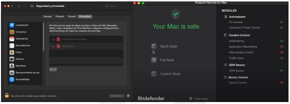 Finalmente entramos a la Configuración del equipo para luego entrar en la sección de Seguridad y Privacidad, es aquí donde se debe permitir los accesos a Bitdefender y quedará la