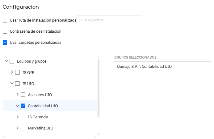 - Usar carpetas personalizadas (Si queremos organizar la estructura de nuestra red, escogiendo el grupo de trabajo al que se reportará el equipo que instalemos)